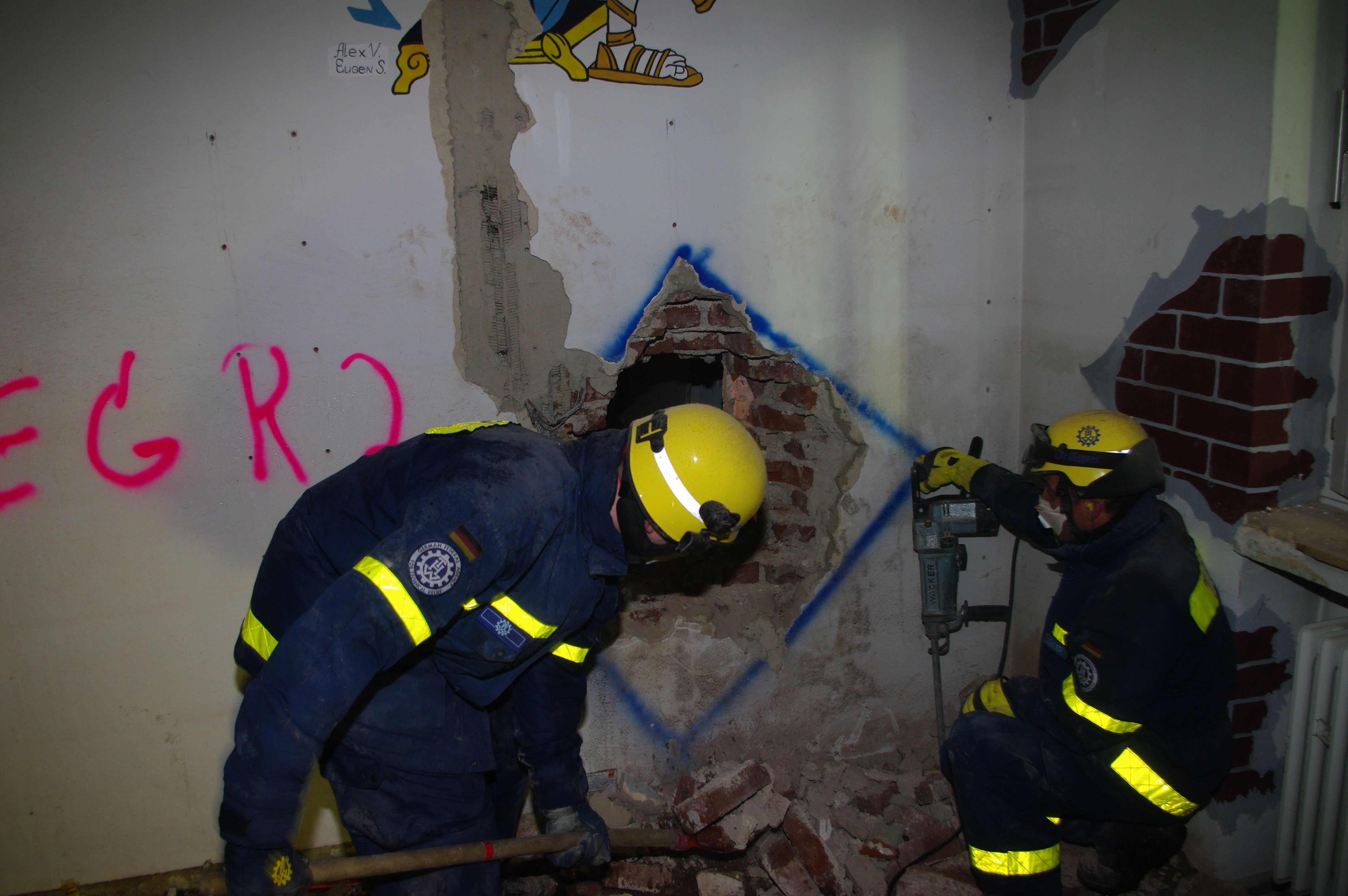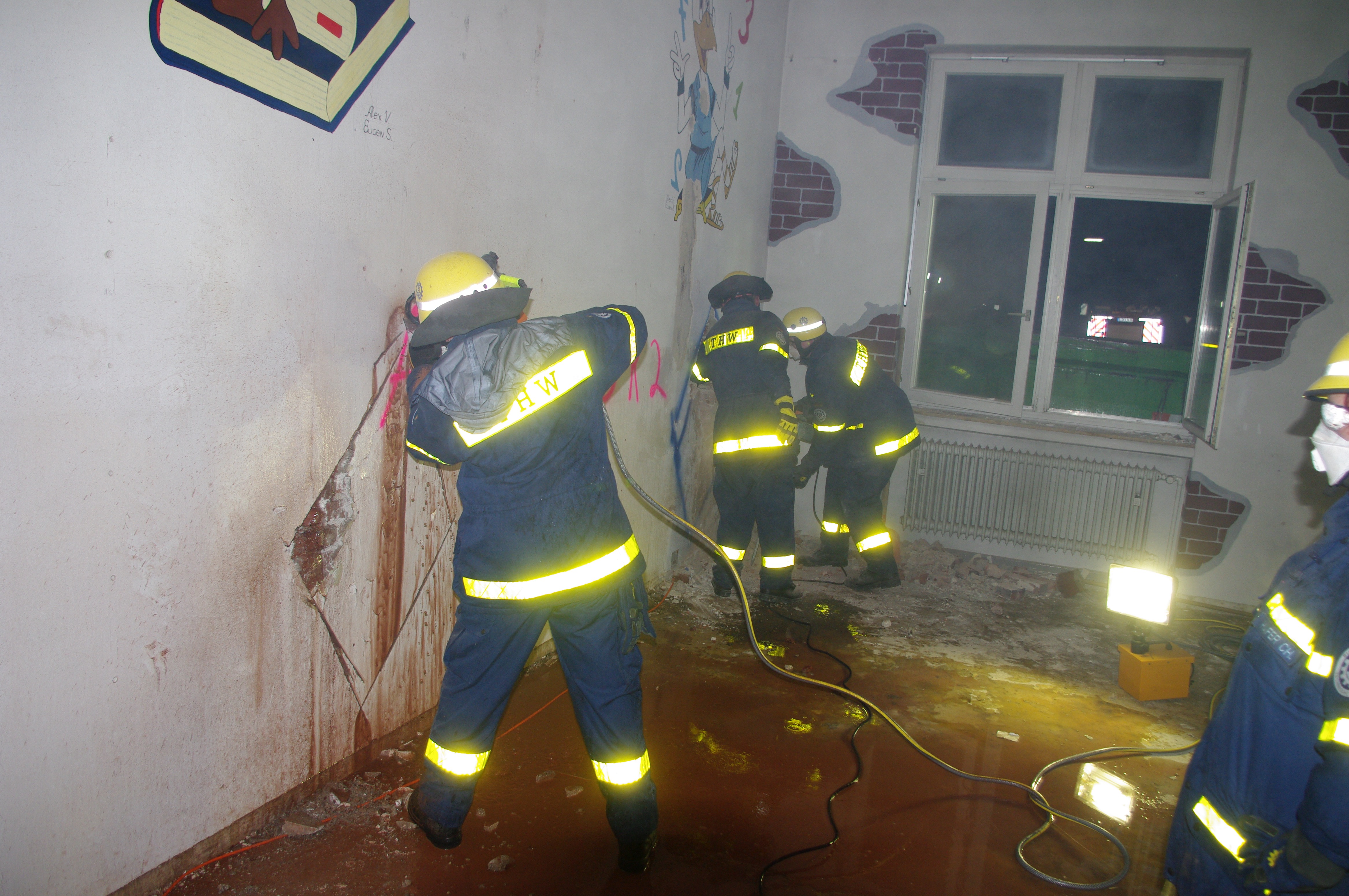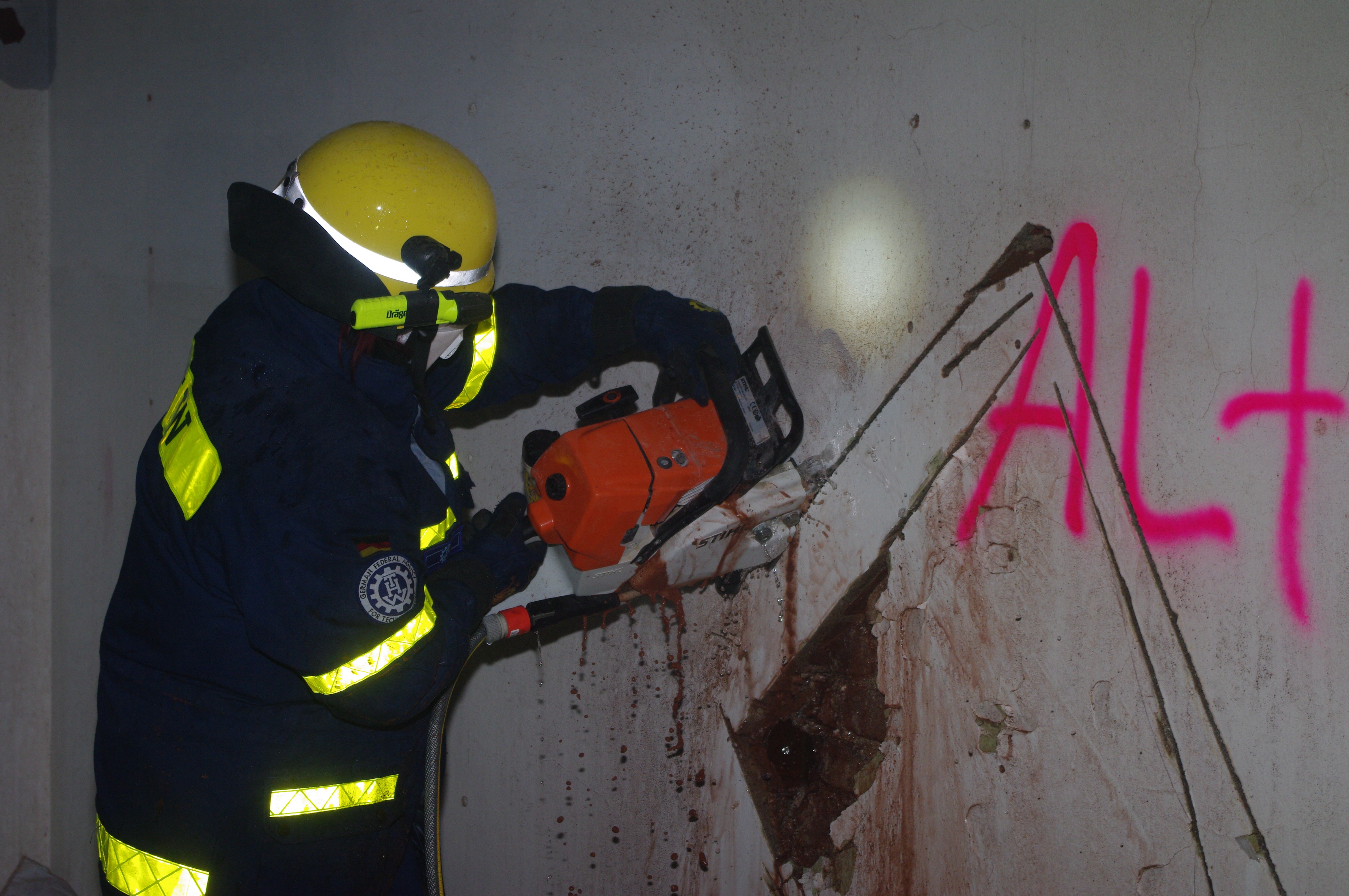 Während die Fachgruppe Beleuchtung zunächst den Außenbereich taghell ausleuchtete, begannen die Bergungsgruppen mit der Erkundung im Gebäudeinneren. Hier musste zum Teil sogar unter Atemschutz vorgegangen werden. Das Besondere an dieser Übung: sowohl beide 1. Bergungsgruppen, als auch die 2. Bergungsgruppe konnten aufgrund der Größe des Objekts parallel vorgehen und unterschiedliche Werkzeuge und Methoden zur Erfüllung der Aufgabe austesten. Dabei kamen neben dem klassischen Gesteinsbohrhammer und dem motorbetriebenen Trennschleifer auch die in Siegen vorgehaltene spezielle wassergekühlte Rettungssäge zum Einsatz. Um den Abtransport möglicher "Verletzter" auch aus den oberen Stockwerken zu ermöglichen, wurde mit Hilfe des Einsatzgerüstsystems (EGS) ein Ausleger im Gebäude verbaut.