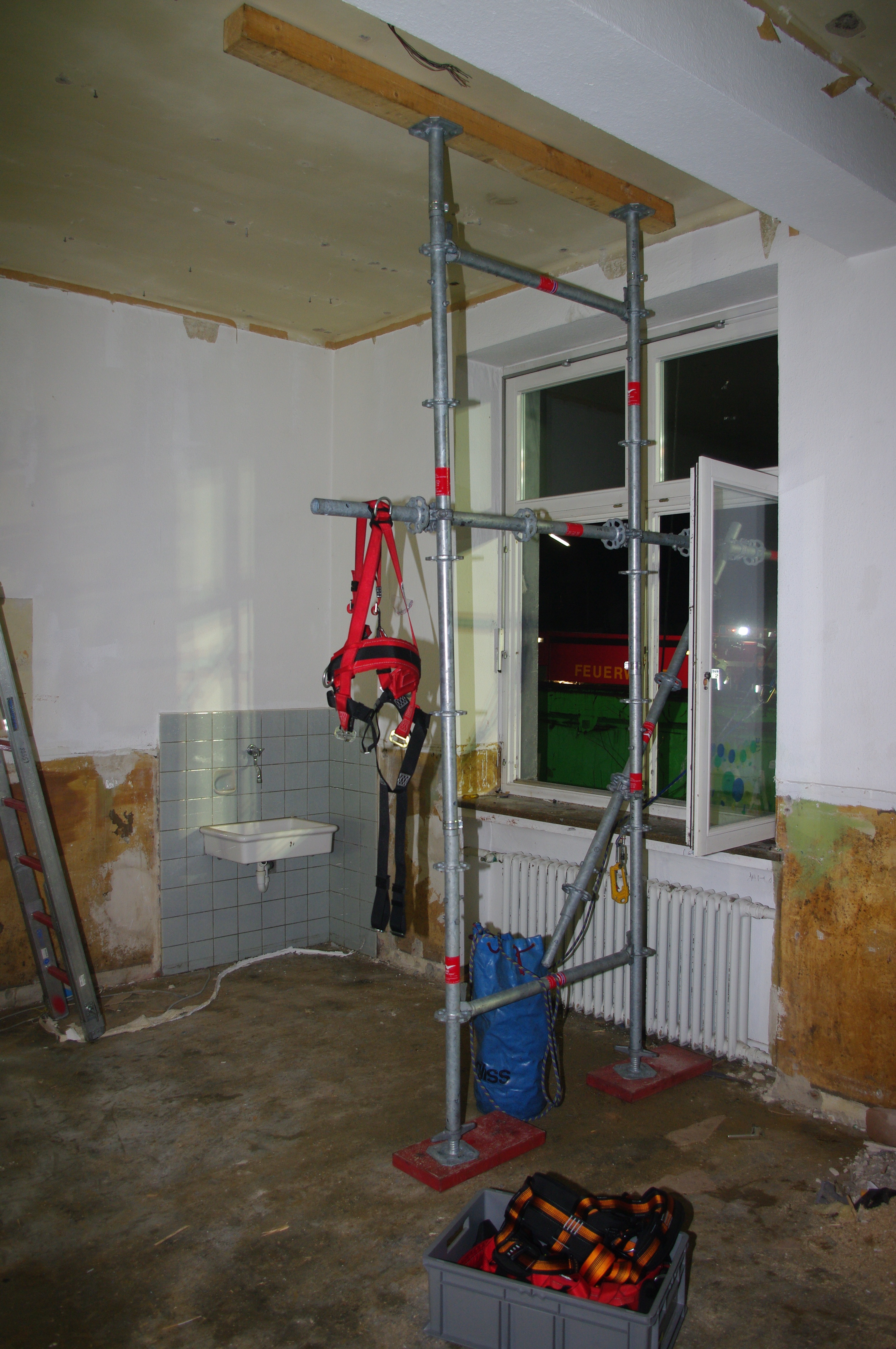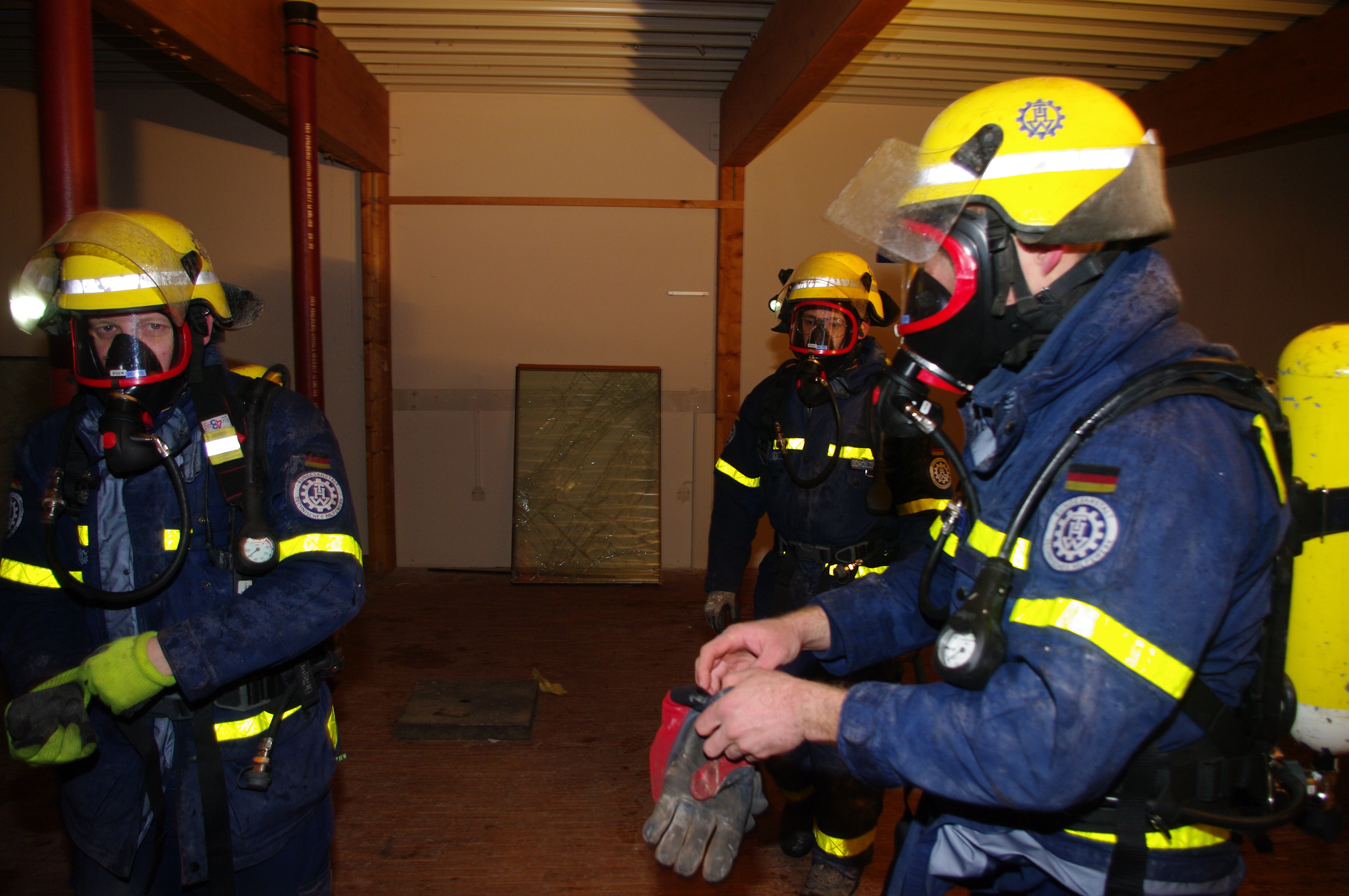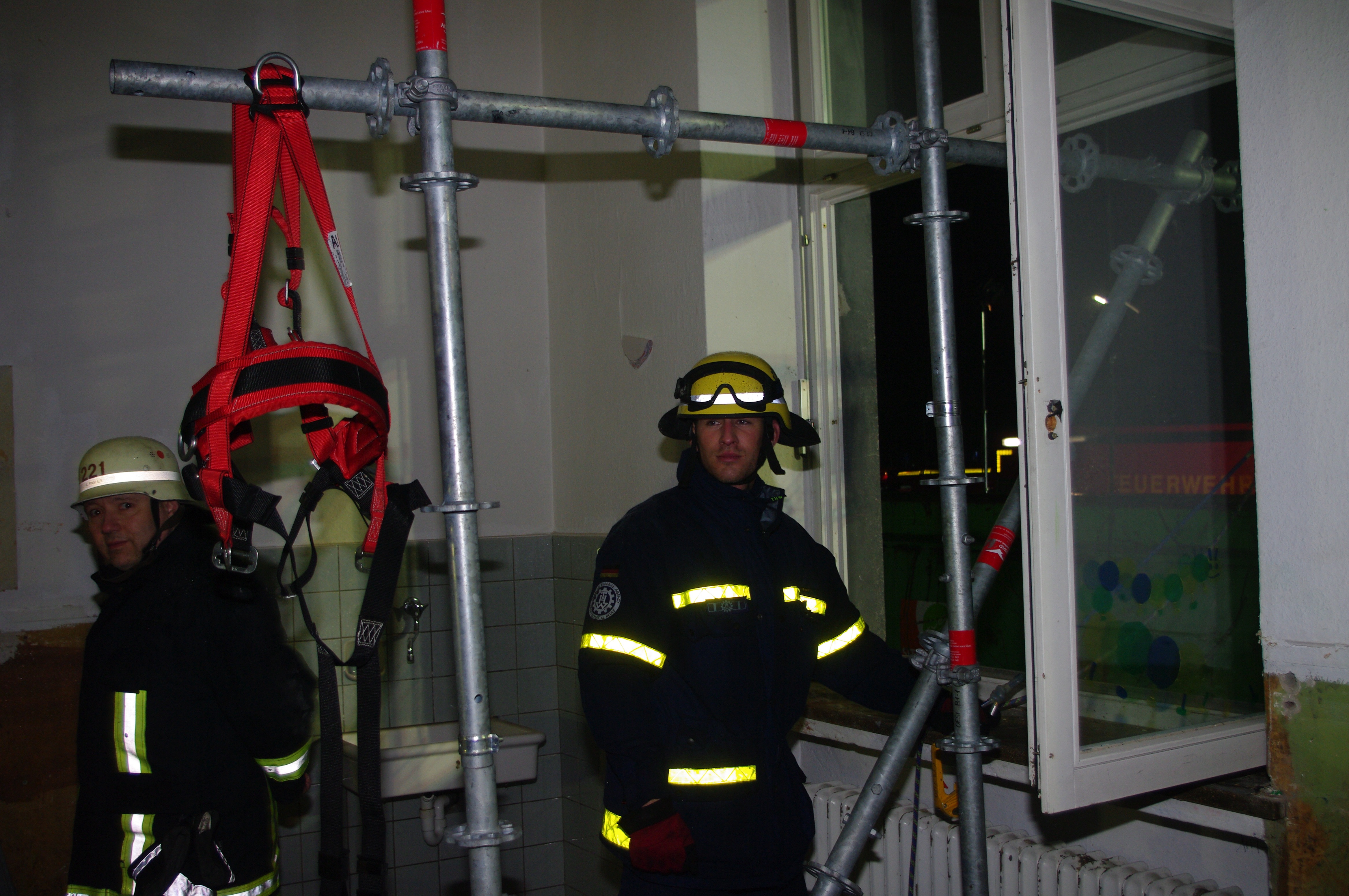 Während die Fachgruppe Beleuchtung zunächst den Außenbereich taghell ausleuchtete, begannen die Bergungsgruppen mit der Erkundung im Gebäudeinneren. Hier musste zum Teil sogar unter Atemschutz vorgegangen werden. Das Besondere an dieser Übung: sowohl beide 1. Bergungsgruppen, als auch die 2. Bergungsgruppe konnten aufgrund der Größe des Objekts parallel vorgehen und unterschiedliche Werkzeuge und Methoden zur Erfüllung der Aufgabe austesten. Dabei kamen neben dem klassischen Gesteinsbohrhammer und dem motorbetriebenen Trennschleifer auch die in Siegen vorgehaltene spezielle wassergekühlte Rettungssäge zum Einsatz. Um den Abtransport möglicher "Verletzter" auch aus den oberen Stockwerken zu ermöglichen, wurde mit Hilfe des Einsatzgerüstsystems (EGS) ein Ausleger im Gebäude verbaut.